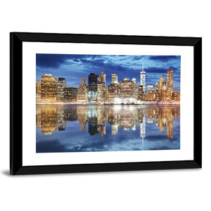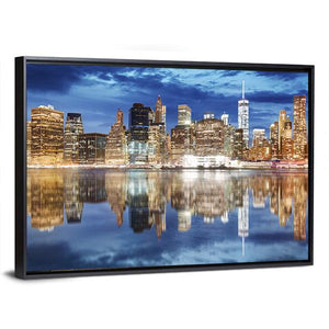 Capture the vibrant energy of New York with this striking depiction of the Manhattan skyline. Featuring One World Trade Center and a reflection in rippling water, this artwork showcases glowing windows against a palette of blue and golden hues, perfect for an urban-themed space.