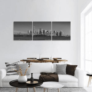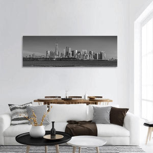 A panoramic print of the Manhattan skyline featuring One World Trade Center, presented in monochromatic, photorealistic detail. Grayscale tones, reflective water in the foreground, and distant birds create an iconic, urban, and majestic atmosphere. Suited to modern interiors such as living rooms or offices.