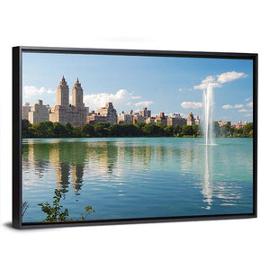 Manhattan’s skyline meets a calm lakeside scene, with fountain spray and reflections in the water rendered in realistic detail. A blue‑green, beige and white palette and a rule-of-thirds composition create a calm, scenic urban mood that fits modern interiors and room decor.