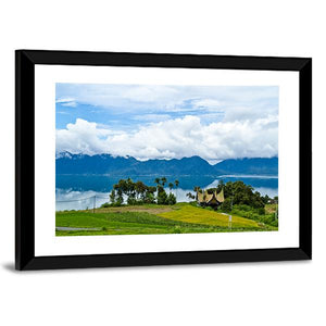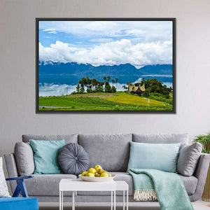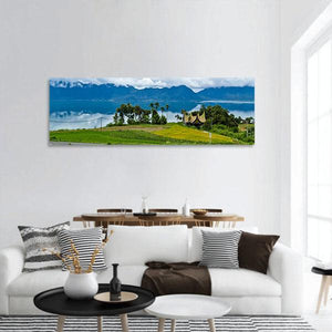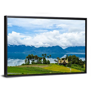 This panoramic canvas captures Maninjau Lake with mountains, a traditional pointed‑roof house, trees and soft clouds. Rendered in a realistic style with blue, green, white and brown tones, the scene feels serene and peaceful as the calm water reflects sky and mountains. It suits modern or nature-inspired rooms as a calm focal point.