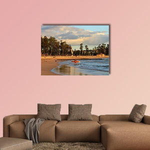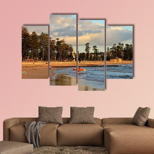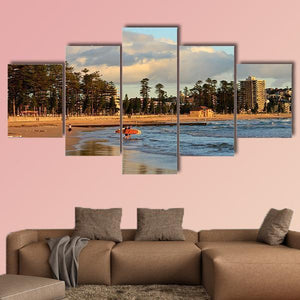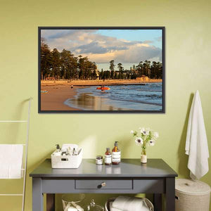 Manly Beach, Sydney rendered as a realistic beach landscape with a person carrying a surfboard and pine trees along the shore. Soft blues, warm oranges and greens create a serene, natural seaside mood that fits coastal or modern living spaces looking for calm, nature-inspired wall art.