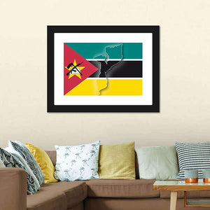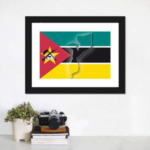 This canvas features the Mozambique flag with the country's map outline superimposed and the flag's rifle and book iconography visible. The graphic, bold composition uses red, yellow, green, black and white for a patriotic, modern look. It works well as wall decor in modern homes or offices.