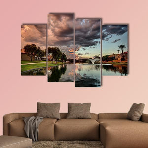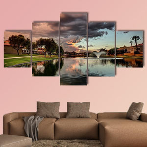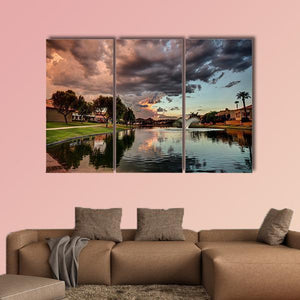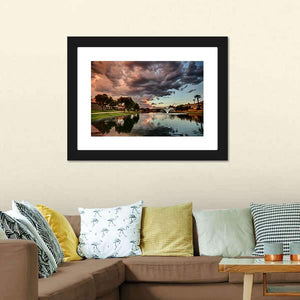 Marguerite Lake Canvas Wall Art depicts a lakeside scene with a fountain, trees and houses reflected in calm water beneath dramatic sunset clouds. The photorealistic image uses blue, brown and orange tones to create a dramatic yet serene mood that works well in modern or nature-inspired rooms.