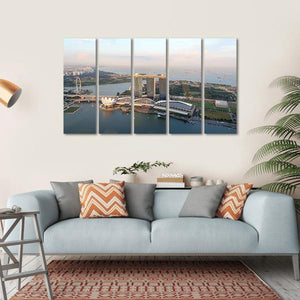 Capture the enchanting skyline of Singapore with this canvas wall art featuring the iconic Marina Bay Sands and ArtScience Museum. The aerial view showcases a serene bay, blending calming hues of blue, green, and grey, evoking an urban yet majestic ambiance.