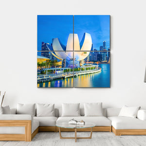 This vibrant canvas art captures the stunning Marina Bay skyline, highlighting the iconic lotus-shaped building and tall skyscrapers reflecting on the tranquil water. With a modern, energetic vibe, it fits beautifully in any contemporary space.