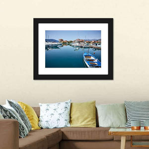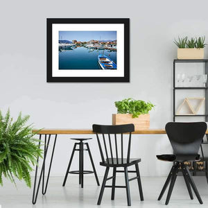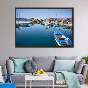 This canvas depicts boats in a quiet harbor, with a small blue-and-white boat in the foreground and sailboats dotting the water. Photorealistic, vibrant colors — blues, orange, green, and white — give the scene a calm, serene, bright feel that suits modern or coastal room decor like living rooms and entryways.
