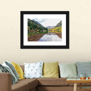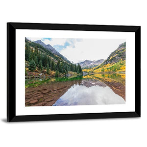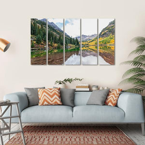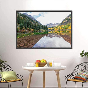 Experience the tranquility of autumn with this canvas art featuring a serene mountain lake surrounded by vibrant fall foliage. The reflection in the water adds a touch of magic to this realistic landscape, making it a perfect addition to your wall decor.