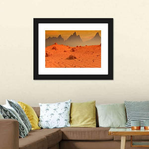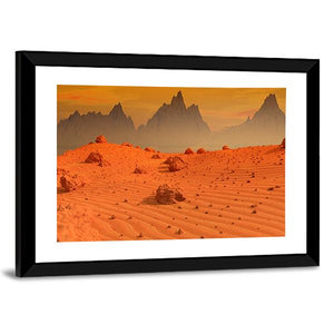 This canvas artwork features a captivating view of Mars, showcasing desert dunes and jagged mountain peaks. The alien and surreal atmosphere is achieved through vivid orange and brown hues, creating a majestic addition to any space.