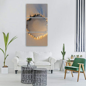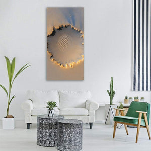 Victoria Crater presents a photorealistic view of an alien crater with complex ripple patterns, jagged rim, and long shadows under dramatic overhead light. Its tan, orange and blue palette and high-detail, dramatic style suit modern or astronomy-themed rooms.