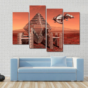 This canvas showcases a futuristic landscape with an alien pyramid and a sleek spaceship soaring through a vibrant orange sky. The blend of red and grey tones captures a mysterious extraterrestrial atmosphere, making it a striking addition to contemporary decor.