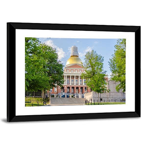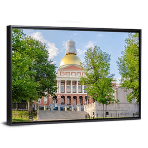 This canvas features a grand depiction of the Massachusetts State House, highlighting its iconic golden dome surrounded by lush trees. The sunny palette of greens, reds, and blues evokes a classic, inviting atmosphere.