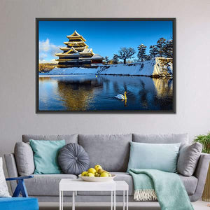 Experience the serene beauty of Matsumoto Castle surrounded by winter's touch. This canvas captures the majestic architecture of the castle, a swan gliding in the moat, and a tranquil snowy landscape, all rendered in a harmonious palette of blue, white, and green.