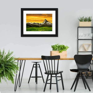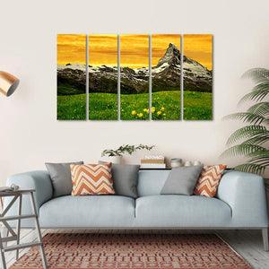 Capture the serene beauty of the Matterhorn at sunset with this vibrant canvas wall art. Featuring a snow-capped peak surrounded by lively yellow wildflowers and textured clouds, it invites a sense of calm to any space.