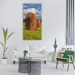Meadow Field Poland features tall, conical haystacks in a green field beneath fluffy white clouds, using a golden-brown, green and blue palette that feels calm and natural. Rendered in a realistic landscape style, it suits rustic or modern living spaces looking for a serene, nature-focused wall accent.