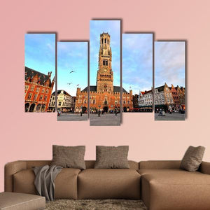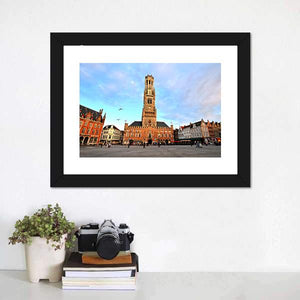 This photorealistic canvas captures the Belfry of Bruges rising over a bustling square, with Gothic architecture, a tall clock tower and a flock of birds. Rendered in blue, orange and brown tones, it carries a historic, grand daytime mood and suits living rooms, hallways or city‑inspired spaces.