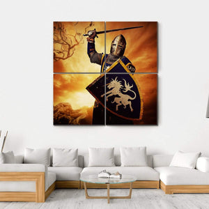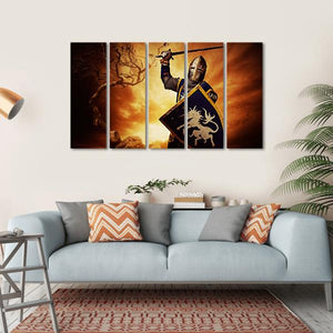 This canvas art captures a heroic knight in armor, boldly holding a sword and shield adorned with a unicorn emblem. Its palette of orange, blue, and gold brings an epic and dramatic touch to any space.
