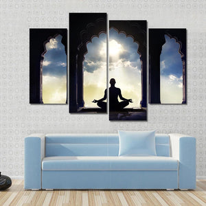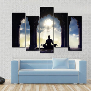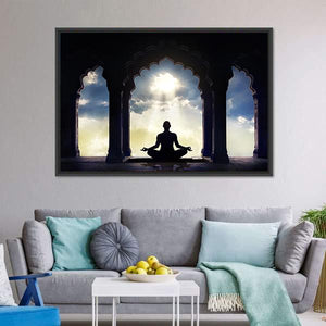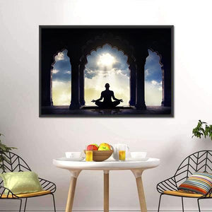 This captivating artwork features a silhouette of a person meditating, framed by an arched doorway. Bathed in serene sunlight and surrounded by clouds, it evokes a peaceful and spiritual atmosphere.