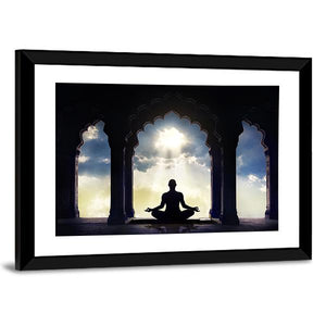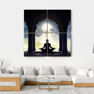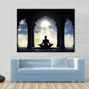 This canvas wall art captures a serene silhouette of a meditator framed by an arched doorway, with gentle sun rays illuminating the scene. The peaceful colors of dark blue, gold, and white evoke a tranquil, spiritual energy, making it a lovely addition to any space that seeks a minimalist touch.
