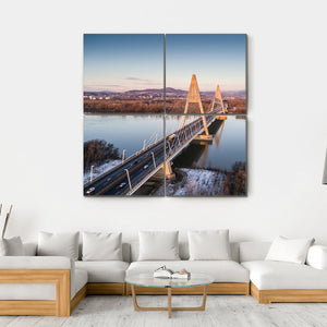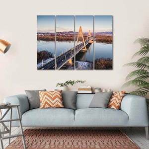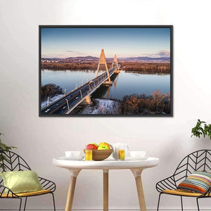 This serene canvas art features a photorealistic depiction of the Megyeri Bridge spanning a tranquil river in Hungary. With a calming palette of blue, brown, and orange, it captures the natural beauty of the surrounding mountains and trees, making it a stunning addition to your wall decor.