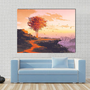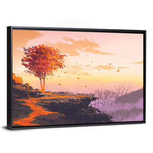 This serene landscape features a mesmerizing tree set against vibrant autumn hues of orange, pink, and purple. The dreamy sunset creates a warm atmosphere, making it a beautiful addition to any modern decor.