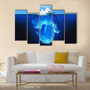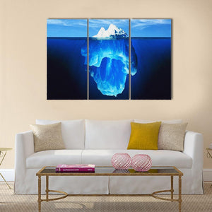 Melting Iceberg In Antarctic Sea shows a split-view scene of a partially submerged iceberg with clear blue water below and wispy clouds above. The realistic, nature-photography treatment creates a serene, majestic, cold mood. It works well in modern or nature-inspired rooms as a calm focal point.
