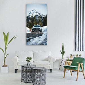 Mercedes Benz In Tyrol shows a Mercedes Benz on a snowy mountain road, framed by pine trees with a centered, dramatic perspective. The photorealistic image reads cold, adventurous, and serene in blue, white, green, gray, and black tones. It suits modern or automotive-themed rooms, and the car's license plate is visible.