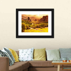 Experience the serene beauty of Greece with this canvas art depicting majestic rock formations and a sunlit valley. The warm palette of greens, browns, and golds brings a dramatic touch to your space, making it ideal for various decor styles.