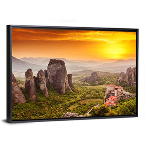 This canvas print showcases the Monastery of Rousanou amidst striking rock formations and majestic mountains in Greece. The serene sunset sky envelops the scene in hues of orange and gray, creating an awe-inspiring atmosphere perfect for those who appreciate nature's beauty.