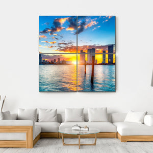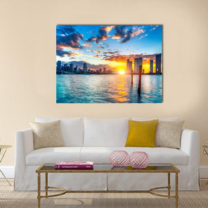 This canvas art beautifully captures the Miami city skyline at sunset, featuring vibrant blues, oranges, and yellows. Its serene vibe and picturesque scene of tall buildings reflecting on the ocean make it a stunning addition to your wall decor.
