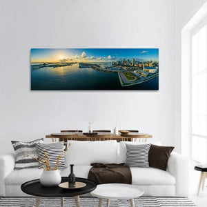 A panoramic cityscape showing Miami’s skyline, ocean, and bridges at sunrise or sunset, rendered in a modern photorealistic style. Cool blues, gold highlights, and soft clouds create a serene, majestic, expansive atmosphere that works well in modern living rooms or offices.