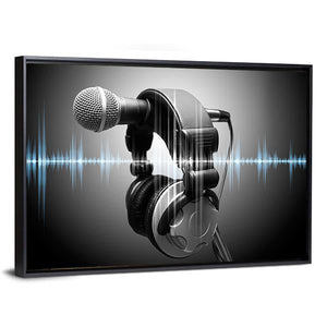This canvas art features a modern digital rendering of a microphone and headphones, enhanced by a striking blue sound wave visualization. The black, white, and gray palette adds a dynamic touch, making it a perfect addition to any music lover's space.
