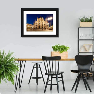 This canvas art captures the majestic Milan Cathedral illuminated at night, showcasing the stunning Gothic architecture. The photo-realistic style and rich blue, white, and gold palette invite a sense of tranquility and sophistication, making it an ideal piece for elegant room decor.