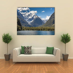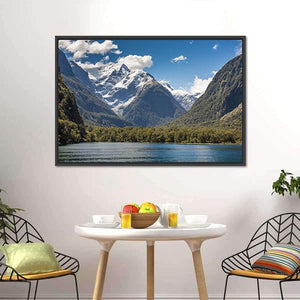 Milford Sound, Fiordland presents snow-capped mountains, a dense evergreen forest, and a calm lake in a wide, layered landscape that feels serene and majestic. The realistic palette of blue, green, white and brown enhances depth and natural beauty. This canvas suits modern home decor and adds a peaceful focal point to living spaces.