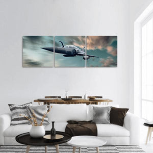 A dark fighter jet cuts through an atmospheric sky in a powerful, dynamic panoramic scene. The blue-gray palette and dramatic cloud motion create an intense, modern look that fits well in contemporary rooms and offices seeking aviation-inspired wall decor.