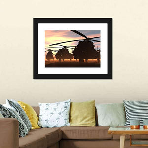 This canvas features dramatic silhouettes of two military helicopters against a stunning sunset. The rich palette of orange, pink, and brown creates an atmospheric scene that captures the power of flight. A perfect addition to your wall decor.
