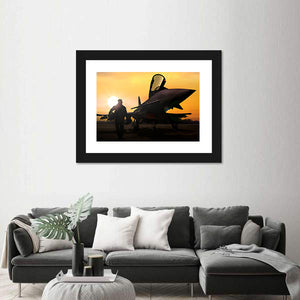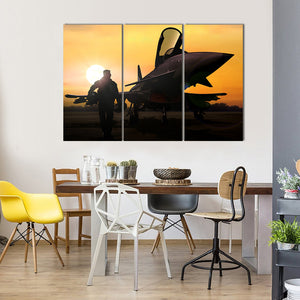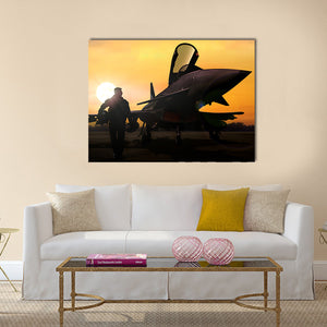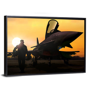 Military pilot and aircraft at airfield on mission standby during sunset Canvas Wall Art is designed to resonate and spark a mix of feelings. Whether you love art or just looking to decorate your home, this striking and powerful canvas print is an eye-catching decor element that can't go unnoticed.