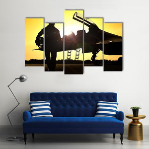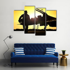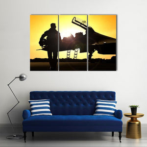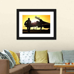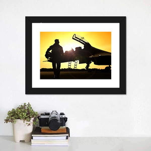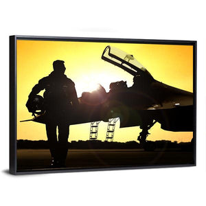 This canvas art captures the silhouette of a military pilot against a dramatic sunset, showcasing a fighter jet framed by vibrant yellows and oranges. Its cinematic style adds a powerful touch, making it a striking addition to any wall.