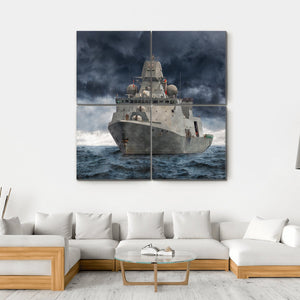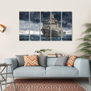 This canvas wall art depicts a powerful warship battling the elements amidst a stormy ocean. The intense composition showcases dramatic lighting, dark turbulent clouds, and choppy blue waves, creating a striking atmosphere that enhances any space.