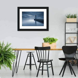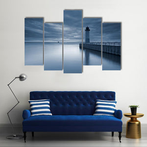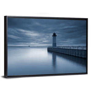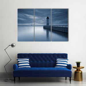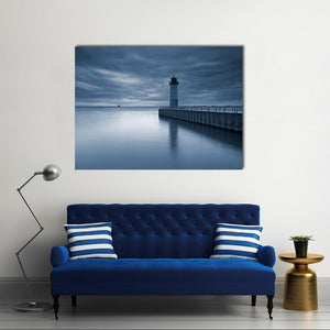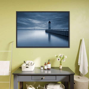 This captivating canvas art features a serene lighthouse standing proudly against a moody sunset sky. The calming palette of blue, gray, and white, along with distant sailboats, creates a dramatic yet minimalist piece that enhances any wall.