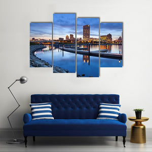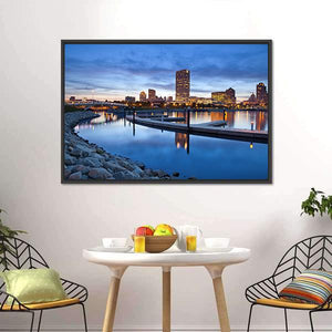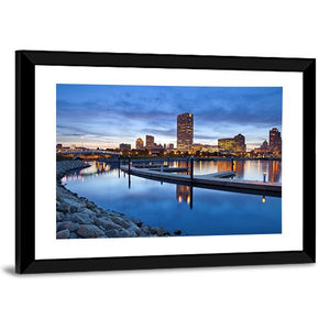 Capture the serene beauty of Milwaukee at dusk with this stunning cityscape. The vibrant palette of blue, orange, and gray highlights illuminated buildings and calm waterfront reflections, making it a captivating addition to your wall decor.