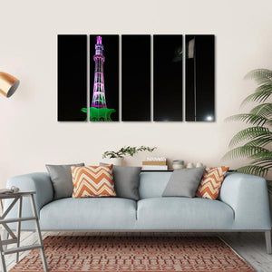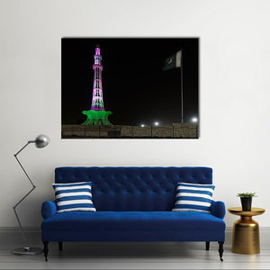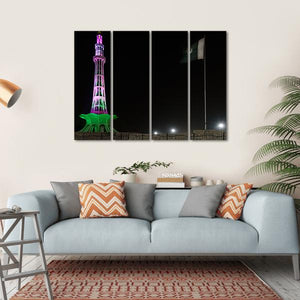 Experience the vibrant spirit of Lahore with this stunning depiction of the Minar-E-Pakistan. Illuminated in festive green and purple hues, it celebrates national pride and beauty, making it an eye-catching centerpiece for any room.