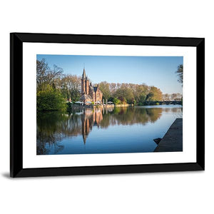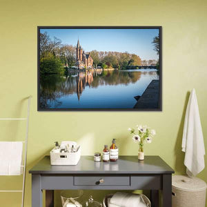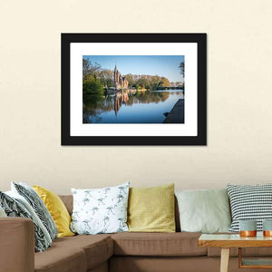 Minnewater Castle sits beside a calm lake, its pointed spires mirrored in still water beneath a clear blue sky. This realistic landscape carries a peaceful, picturesque mood in a blue, green and brown palette. It works well as a quiet focal point in modern living spaces and room decor.