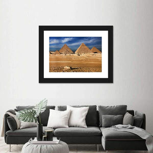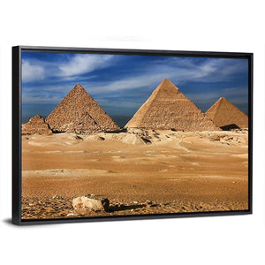 The Egyptian pyramids take center stage in this panoramic photographic canvas, showing three prominent pyramids rising from sandy terrain beneath a broad blue sky. The image carries an epic, ancient, majestic mood with tan, brown and white tones and wispy clouds that suggest calm movement. It complements modern interiors and room decor that favor landscape or travel-inspired art.
