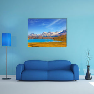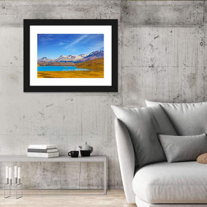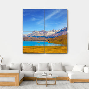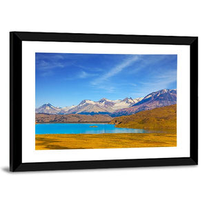 This artwork captures a serene landscape featuring a clear blue lake, majestic snow-capped mountains, and vibrant golden grasslands. Its realistic style invites a sense of calm and tranquility, making it a lovely addition to any nature-inspired decor.