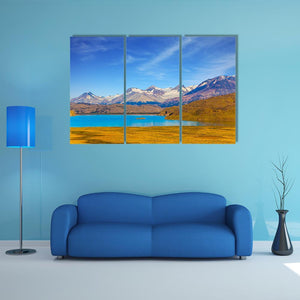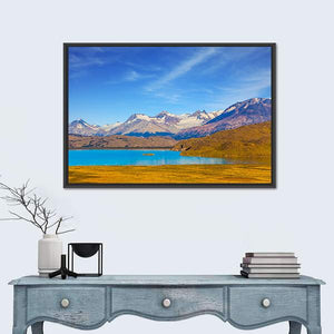 Mirror Lake With Icy Water shows a vibrant blue lake framed by snow-capped mountains, a golden field, and wispy clouds. The realistic landscape follows a rule-of-thirds composition and carries a serene, vast, bright mood. It fits well in modern living rooms or offices that favour nature-inspired wall art.