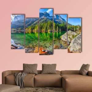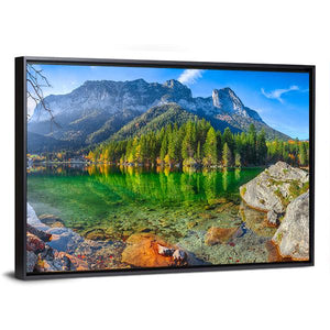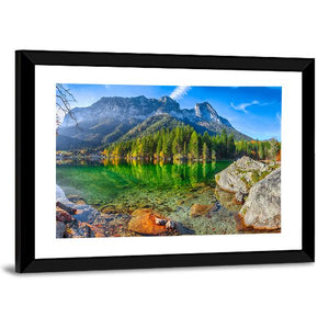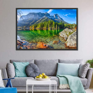 Hintersee Lake in Germany captures a serene, realistic view of a mountain lake with clear water revealing rocks beneath, trees mirrored on the surface, and snow-capped peaks in the distance. Rendered in green, blue, grey, and brown tones, this landscape print brings a peaceful, majestic mood and works well in living rooms, bedrooms, or nature-themed spaces.