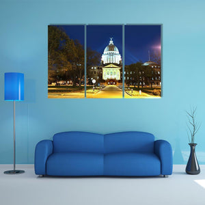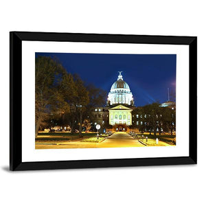 This canvas artwork features the majestic Mississippi State Capitol, beautifully illuminated against a serene night sky. The symmetric composition highlights the ornate dome and arched windows, making it a striking addition to your decor.
