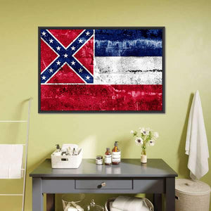 Mississippi Flag Canvas Wall Art features a vintage, textured depiction of the flag with a red, blue, and white palette. The rule-of-thirds composition gives the image a measured, patriotic mood that fits well in home wall decor. Place this canvas print in a living room or entryway for a quietly nostalgic touch.