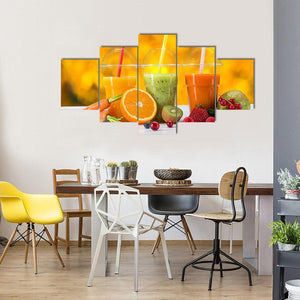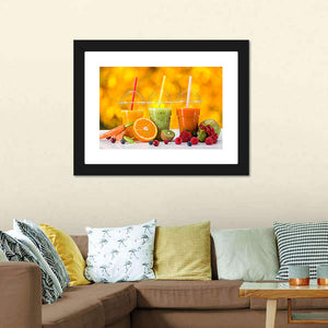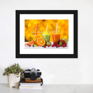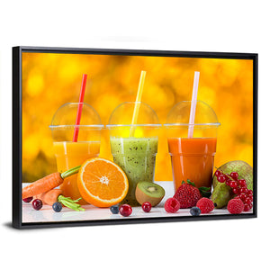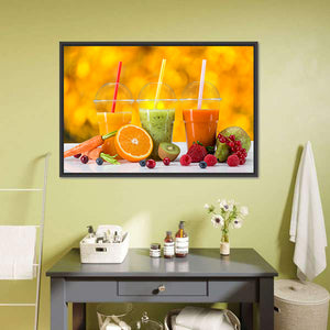 This vibrant canvas showcases an array of colorful fruit juices alongside fresh fruits like strawberries, raspberries, and kiwi. Its cheerful atmosphere, complemented by a blurred background, makes it a refreshing addition to any wall decor.