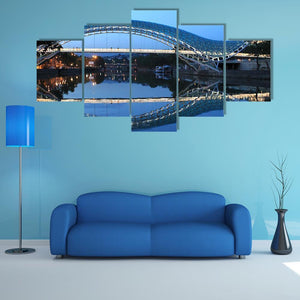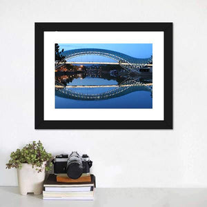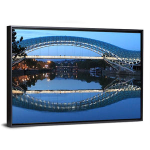 This captivating canvas features a serene image of a glass-roofed bridge illuminated at night, with tranquil reflections shimmering in the water. The modern, realistic style and soothing blue and white palette make it a perfect addition to your home decor.